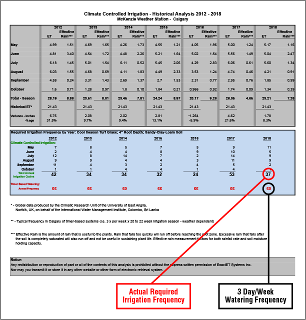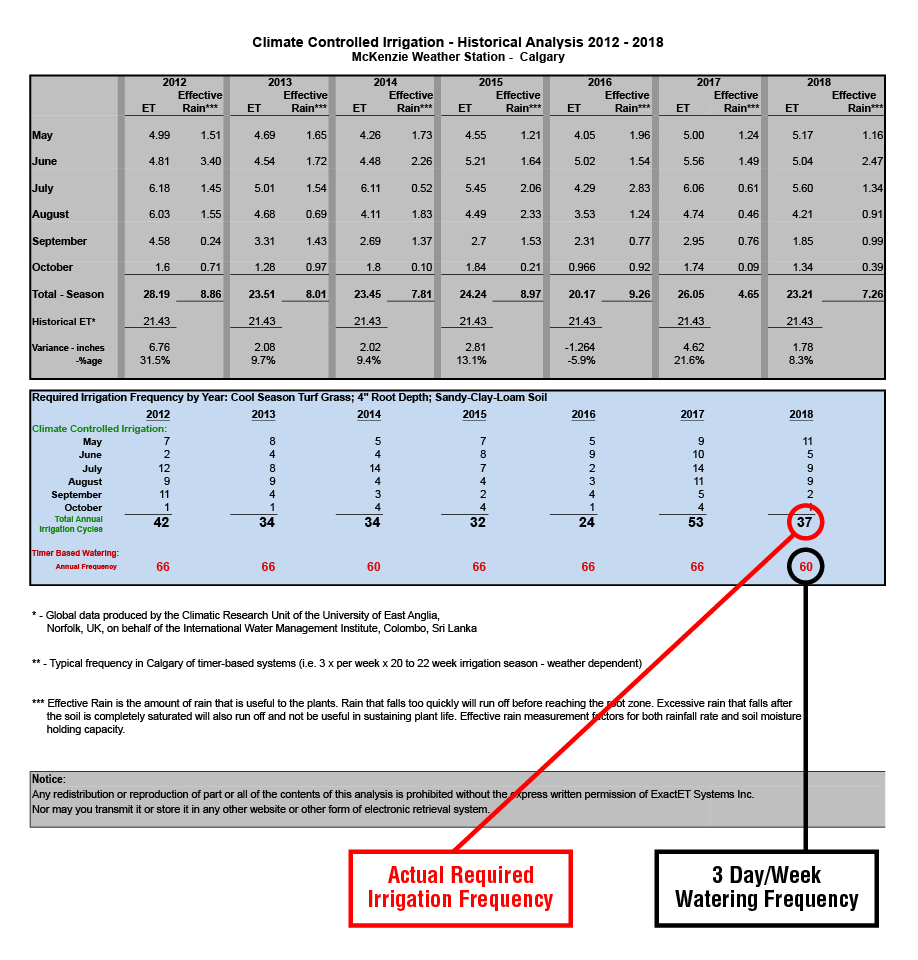 A study by the City of Calgary demonstrated that typical timer based irrigation systems were applying 8 feet of water to the landscape each year when on average, only 2 to 2.5 feet is required.